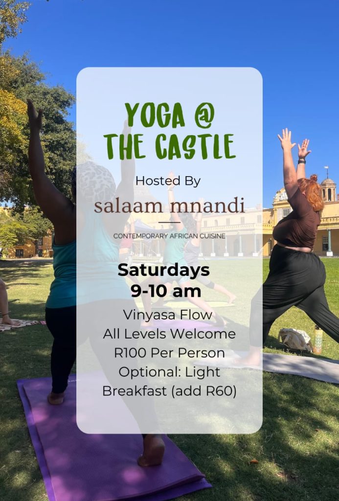 Find your balance and start your weekend refreshed with Yoga @ The Castle. Hosted by Salaam Mnandi, these Vinyasa Flow classes welcome all levels to stretch, breathe, and relax in the heart of Cape Town. For R100 per person, enjoy an hour of guided movement every Saturday from 9-10 AM. Want to treat yourself afterwards? Add a light breakfast for just R60 and make it a perfect start to your day. Feel the peace, right where history meets the present.