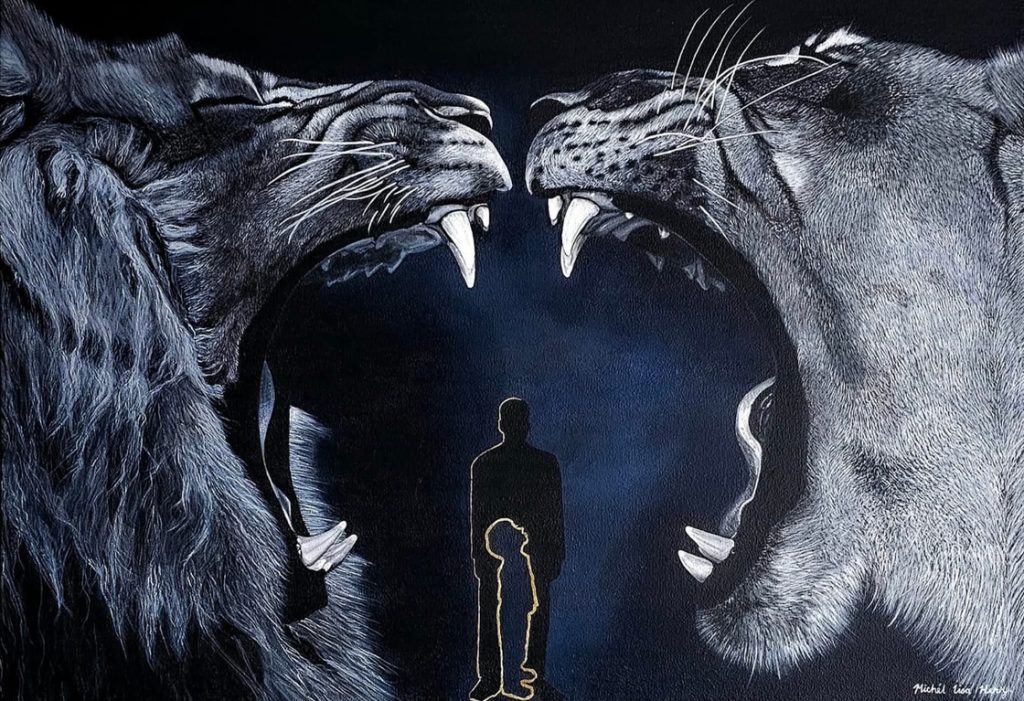 A dramatic and emotive piece exploring internal conflict, layered with bold brushstrokes and shadowed tones that evoke the spiritual battles we all face.